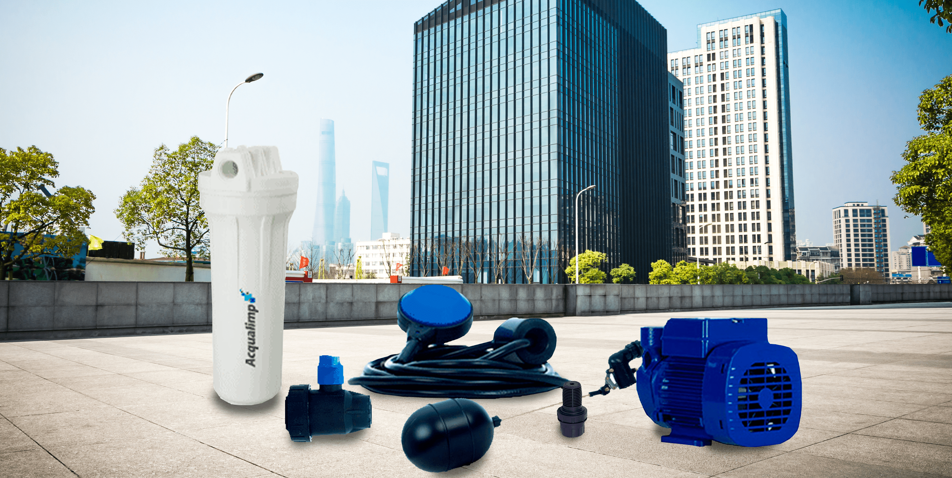 Acessórios: filtro ponto de entrada, registro de esfera, eletronível, bomba, válvula boia e válvula de retenção.